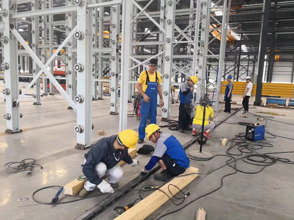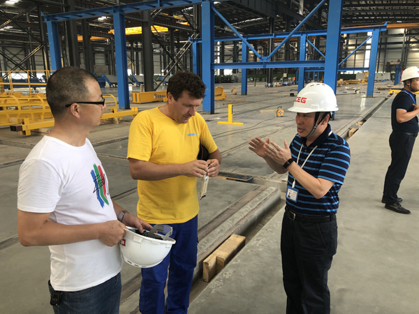 公司员工在外方专家的指导下安装设备