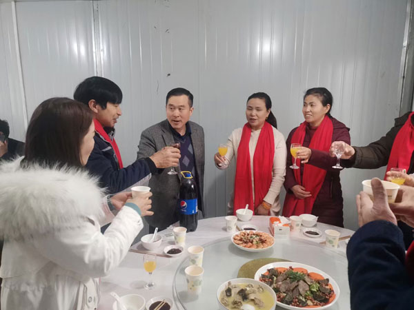 年夜饭现场洋溢着热闹和喜庆的气息,大盘小蝶、冷拼热菜陆续传上餐桌,大家团团定坐,同举斟满幸福的酒杯,共祝丰年佳节。公司领导一一向大家敬酒,将年夜饭的气氛推上了高潮。